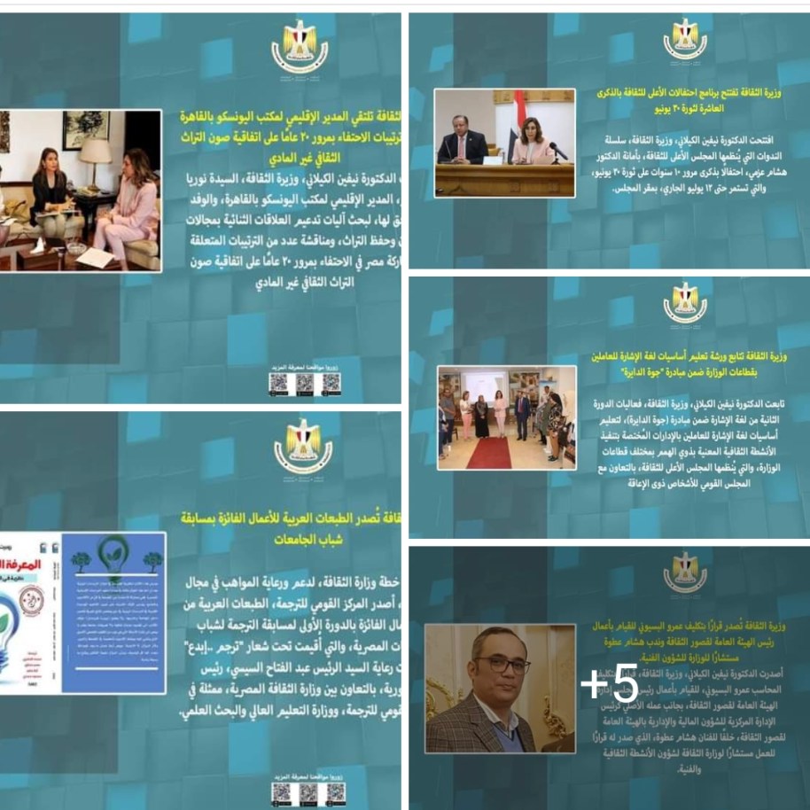 تحت رعاية وبحضور الدكتورة نيفين الكيلاني، وزيرة الثقافة، يُقيم المجلس الأعلى للثقافة، بأمانة الدكتور هشام عزمي، سلسلة من الندوات حول القضايا المرتبطة بالثورة ودورها في بناء الجمهورية الجديدة، احتفالًا بذكرى مرور ١٠ سنوات على ثورة ٣٠ يونيو، وذلك خلال الفترة من الإثنين ١٠ يوليو حتى الأربعاء ١٢ يوليو الجاري، وذلك بمقر المجلس الأعلى للثقافة. - وزارة الثقافة تُصدر الطبعات العربية للأعمال الفائزة بمسابقة شباب الجامعات