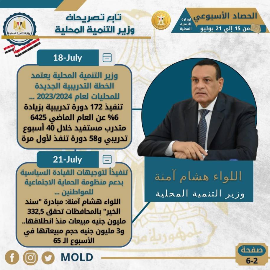 أصدر المركز الإعلامي التابع لوزارة التنمية المحلية، “الانفوجراف الأسبوعي” في نسخته الـ 44 حول حصاد أهم الأنشطة والفعاليات التي قام بها اللواء هشام آمنة وزير التنمية المحلية، خلال الأسبوع الماضي في الفترة من 15 حتى 21 يوليو الجاري، حيث نستعرض أبرزها في التقرير التالي الذي نشرته الصفحة الرسمية لوزارة التنمية المحلية على موقع التواصل الاجتماعي “فيس بوك” من خلال انفوجراف يرصد أبرز تلك الأنشطة التي جاءت كالتالي:
