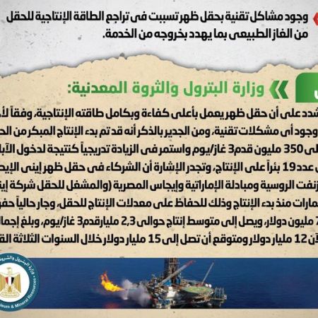 الحكومة تنفى وجود مشاكل تقنية بحقل ظهر تسببت في تراجع الطاقة الإنتاجية