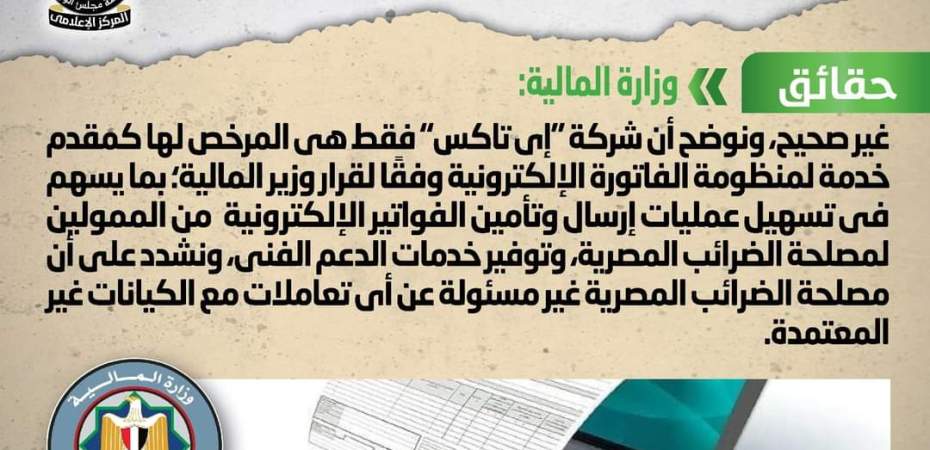 تداولت بعض المواقع الإلكترونية وصفحات التواصل الاجتماعي أنباء بشأن اعتماد مصلحة الضرائب المصرية بعض الشركات كوسيط لإرسال الفواتير لمنظومة الفاتورة الإلكترونية، وقد قام المركز الإعلامي لمجلس الوزراء بالتواصل مع وزارة المالية، والتي نفت تلك الأنباء، مُؤكدةً أنه لا صحة لقيام مصلحة الضرائب المصرية باعتماد شركات أو برامج وسيطة لإرسال الفواتير إلى منظومة الفاتورة الإلكترونية، مُوضحةً أن شركة “إي تاكس” فقط هي المرخص لها كمقدم خدمة لمنظومة الفاتورة الإلكترونية وفقاً لقرار وزير المالية بما يسهم في تسهيل عمليات إرسال وتأمين الفواتير الإلكترونية من الممولين لمصلحة الضرائب المصرية، وتوفير خدمات الدعم الفني، مُشددة ًعلى أن مصلحة الضرائب المصرية غير مسئولة عن أي تعاملات مع الكيانات غير المعتمدة.