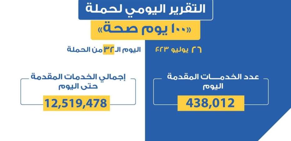 أعلن الدكتور خالد عبدالغفار وزير الصحة والسكان، تقديم 12 مليون و519 ألفا و478 خدمة طبية من خلال حملة «100 يوم صحة» منذ انطلاقها يوم 25 يونيو الماضي، وحتى مساء أمس الأربعاء 26 يوليو، في جميع محافظات الجمهورية.