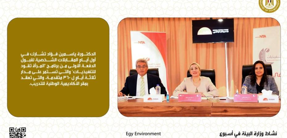 – الدكتورة ياسمين فؤاد وزيرة البيئة تشارك في أول أيام المقابلات الشخصية لقبول الدفعة الأولى من برنامج “المرأة تقود للتنفيذيات” ، والتى استمرت على مدار ثلاثة أيام ل ٣٦٠ متقدمة، بمقر الأكاديمية الوطنية للتدريب، وتؤكد على ان المرأة المصرية استطاعت تقلد المناصب القيادية المختلفة في الفترة الأخيرة، وضرورة أن تمتلك “التنفيذيات” إصرار للوصول إلى أهدافهن وإلغاء كلمة الفشل من قاموس حياتهن.
