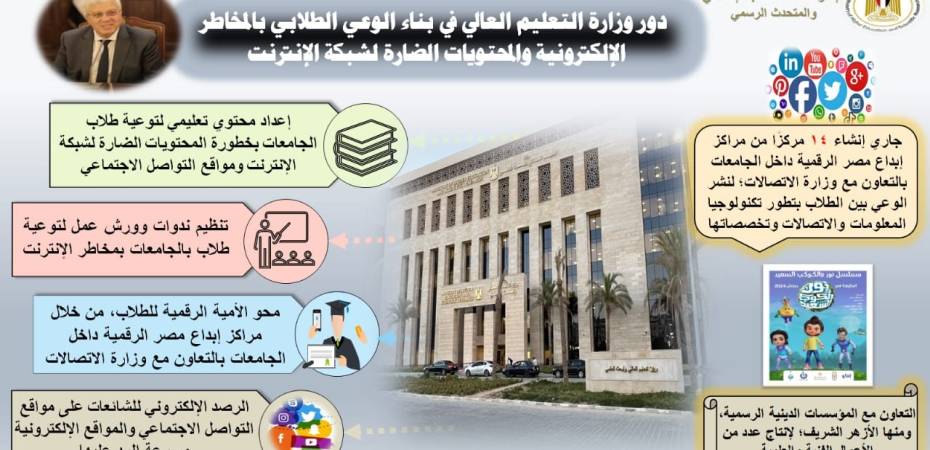 واستعرض الوزير جهود الوزارة لتوعية طلاب الجامعات بخطورة المحتويات الضارة لشبكة الإنترنت ومواقع التواصل الاجتماعي، والتي من بينها إعداد محتوى علمي، بعنوان “التربية الإعلامية الرقمية” وتضمينه في المقرر العلمي “قضايا المجتمع” الذي يُدرس بالجامعات المصرية، وقد رُوعي في هذا المحتوى شموله لكافة المفاهيم والمهارات الخاصة بالإعلام الرقمي؛ لتحصين الطلاب ضد المحتويات الإعلامية المغرضة، وتنمية مهاراتهم في التعامل مع وسائل الإعلام الرقمي، إضافة إلى تمكينهم من التعاطي مع كافة المحتويات والرسائل التي تحفل بها شبكات الإنترنت، وتحقيق أكبر استفادة من التقنيات الحديثة للإعلام الرقمي، دون التورط في الجرائم الإلكترونية، أو السقوط في براثن حروب الجيل الرابع، والحروب النفسية، والدعاية المغرضة، والشائعات التي تفقد الشباب المصري الثقة في دولتهم ومؤسساتها الوطنية.