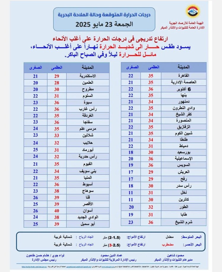 توقعت الهيئة العامة للأرصاد الجوية الإدارة العامة للتنبؤات والإنذار المبكر يسود طقس حار إلى شديد الحرارة نهارًا على أغلب الأنحاء، مائل للحرارة ليلًا وفي الصباح الباكر.