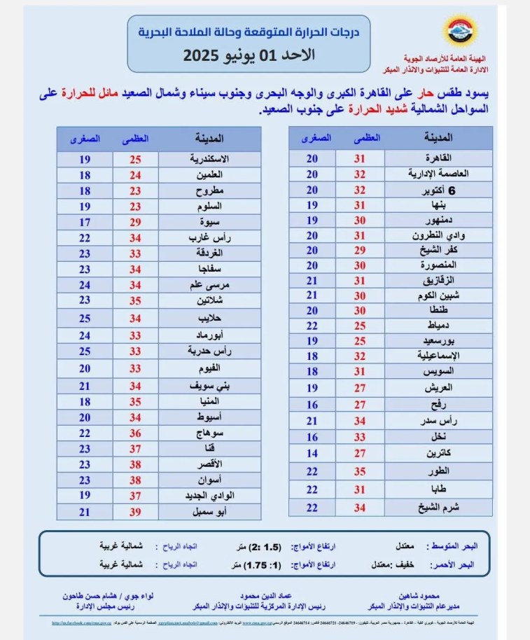 حول حالة الطقس غدًا الأحد.. توقعت الهيئة العامة للأرصاد الجوية الإدارة العامة للتنبؤات والإنذار المبكر يسود طقس ربيعي مائل للحرارة إلى حار نهارا على شمال البلاد حتي القاهرة الكبري وشمال الصعيد، شديد الحرارة على جنوب الصعيد، معتدل الحرارة ليلًا وفي الصباح الباكر.