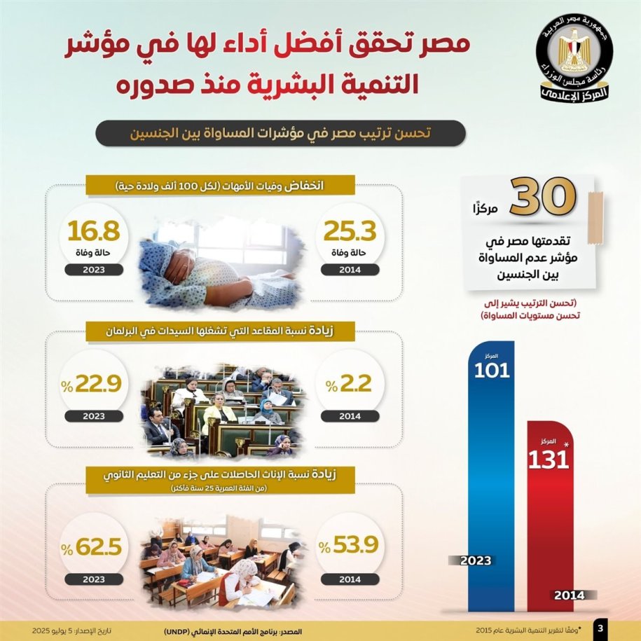 أوضح المركز الإعلامى لمجلس الوزراء أن ذلك ساهم في تحقيق تحولات إيجابية بمحاور وقطاعات التنمية البشرية، وانعكس ذلك في تقدم مصر 8 مراكز في مؤشر التنمية البشرية خلال 10 سنوات.