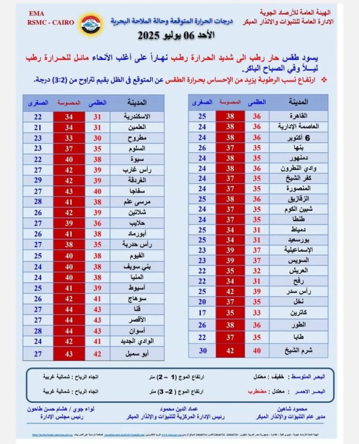 توقعت الهيئة العامة للأرصاد الجوية الإدارة العامة للتنبؤات والإنذار المبكر يسود طقس حار رطب شديد الحرارة رطب نهارا على أغلب الأنحاء، مائل للحرارة رطب ليلًا وفي الصباح الباكر.