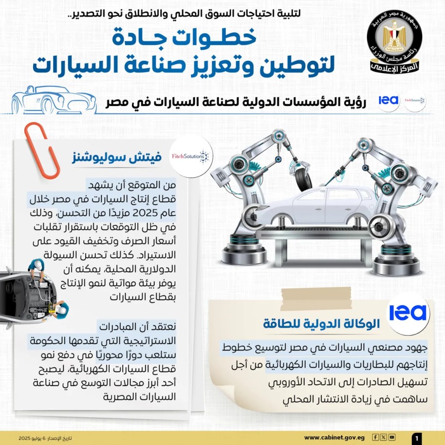نشر المركز الإعلامي لمجلس الوزراء، عددًا من الإنفوجرافات عبر منصاته الرسمية على مواقع التواصل الاجتماعي، تسلط الضوء على الخطوات الجادة التي تتخذها الدولة لتوطين وتعزيز صناعة السيارات، بما يلبي احتياجات السوق المحلي، ويعزز القدرة التصديرية، انطلاقًا من إيمان الدولة بأن الصناعة الوطنية تمثل قاطرة التنمية المستدامة.
