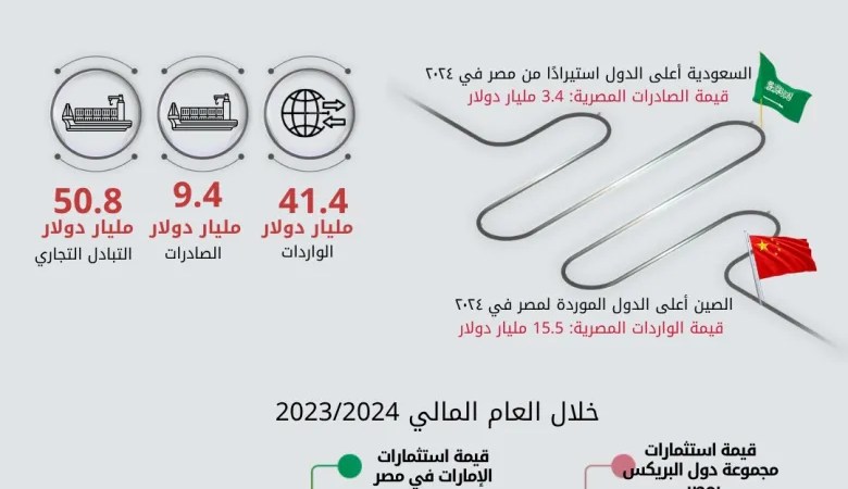 وتصدرت الصين قائمة أعلى مجموعة دول البريكس تصديراً لمصر خلال عام 2024، حيث بلغت قيمة واردات مصر منها 15.5 مليار دولار، يليها السعودية 7.9 مليار دولار، ثم روسيا 6 مليار دولار ثم البرازيل 4.2 مليار دولار، ثم الهند3.3 مليار دولار، ثم الإمارات 2.7 مليار دولار ، ثم إندونيسيا 1.6 مليار دولار ، ثم جنوب إفريقيا 154.3 مليون دولار ، ثم إثيوبيا 22.7 مليون دولار ، ثم إيران 4.9 مليون دولار .