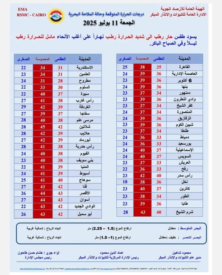 حول حالة الطقس غدًا الجمعة.. توقعت الهيئة العامة للأرصاد الجوية الإدارة العامة للتنبؤات والإنذار المبكر يسود طقس شديد الحرارة رطب نهارا على أغلب الأنحاء، مائل للحرارة رطب ليلًا وفي الصباح الباكر.