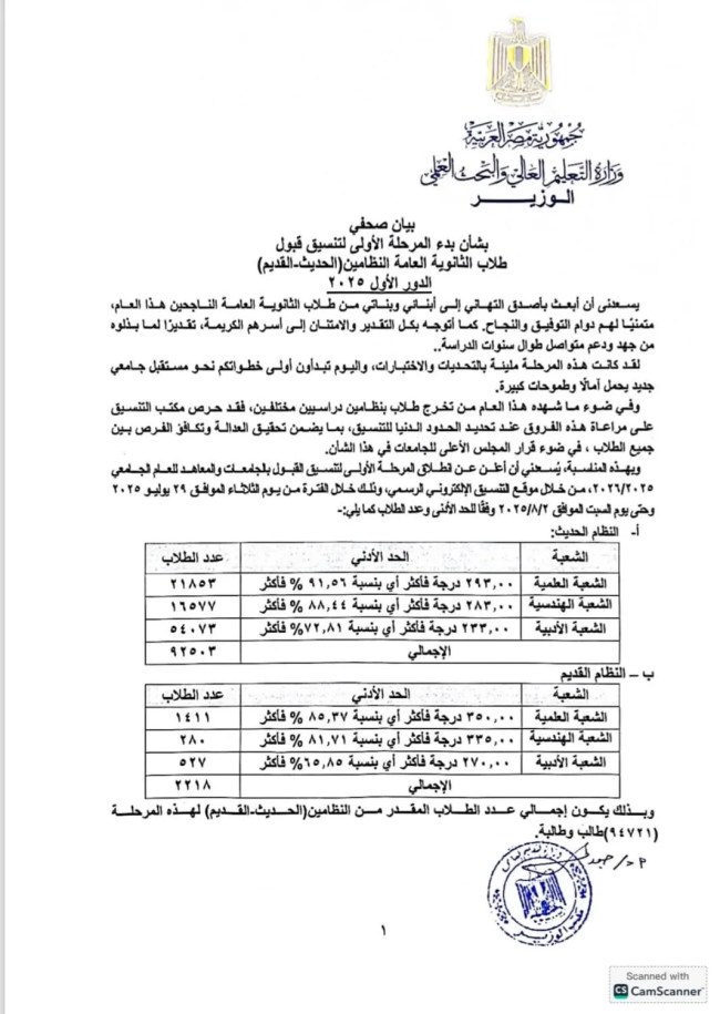 أعلنت وزارة التعليم العالي والبحث العلمي عن بدء المرحلة الأولى لتنسيق قبول طلاب الثانوية العامة للنظامين (القديم والحديث) وتعلن الحدود الدنيا للمرحلة.