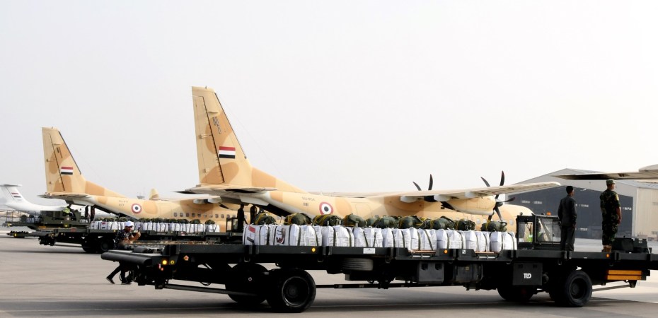 أقلعت 4 طائرات نقل عسكرية من جمهورية مصر العربية محملة بأطنان من المساعدات الغذائية لتنفيذ أعمال الإسقاط الجوى على المناطق التى يصعب الوصول إليها براً بقطاع غزة ، وذلك لتخفيف حدة الأوضاع المعيشية الصعبة ونقص الإحتياجات الإنسانية التى يعانى منها سكان القطاع ، هذا بالتزامن مع إستمرار تقديم المساعدات براً .