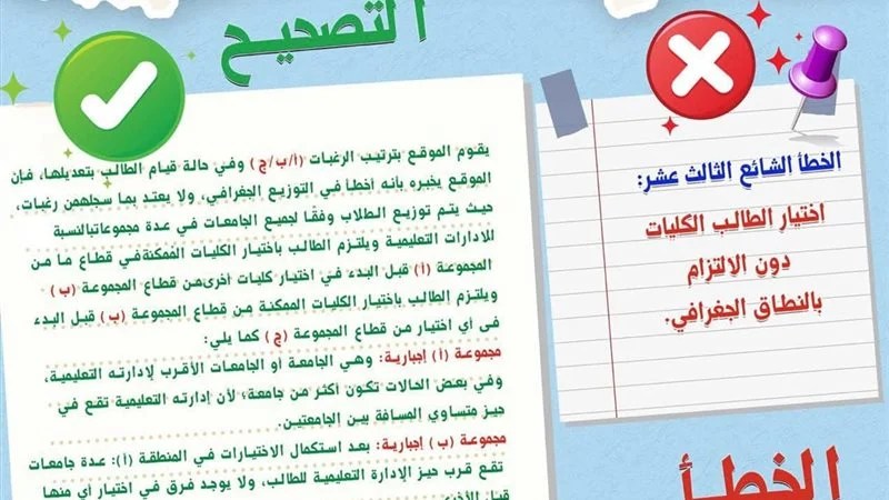 وأشارت الوزارة إلى أن الخطأ الشائع الثالث عشر الذي يقع فيه بعض الطلاب هو اختيار الكليات دون الالتزام بالنطاق الجغرافي المحدد، وهو ما قد يؤدي إلى ترتيب غير دقيق للرغبات أو فقدان فرص القبول في الكليات المرغوبة.