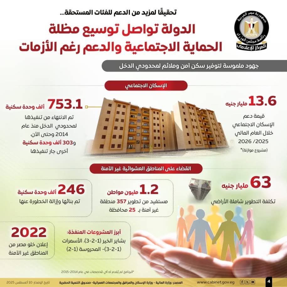 تؤكد هذه الأرقام أن الدولة ماضية بخطى ثابتة نحو تحقيق العدالة الاجتماعية وتحسين جودة الحياة للمواطنين، عبر خطط تنموية تستند إلى استثمارات ضخمة وبنية تحتية متطورة، بما يضمن توفير سكن آمن وحياة كريمة لجميع الفئات المستحقة.