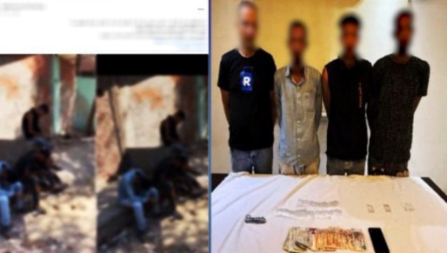 بالفحص بقيادة المقدم مصطفي دياب رئيس مباحث قسم ثان شبرا الخيمة ومعاونة الرائد محمد هاني والنقيب إبراهيم خضر، والنقيب محمود النجار، والنقيب يوسف حمدي والنقيب أمير عز الدين والنقيب كريم عبادة معاوني رئيس المباحث أمكن تحديد وضبط الأشخاص الظاهرين بمقطع الفيديو (3 عاطلين) مقيمين بدائرة القسم، وبحوزتهم (كمية من مخدر البودر)، وبمواجهتهم أقروا بحيازتهم للمادة المخدرة بقصد التعاطى وتحصلهم عليها من عاطل “له معلومات جنائية” – مقيم بدائرة القسم وأمكن ضبطه وبحوزته (كمية من مخدر البودر – سلاح أبيض). . وتم إتخاذ الإجراءات القانونية.