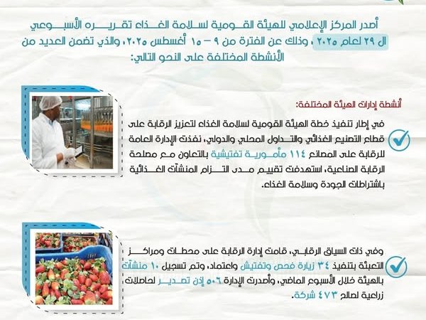 أصدر المركز الإعلامي للهيئة القومية لسلامة الغذاء تقريره الأسبوعي الـ 29 لعام 2025، وذلك عن الفترة من 9 – 15 أغسطس، والذي تضمن العديد من الأنشطة المختلفة على النحو التالي: