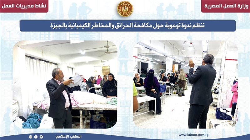 نظمت مديرية العمل بمحافظة الجيزة، من خلال مكتب السلامة والصحة المهنية بمنطقة البدرشين، ندوة توعوية بأحد مصانع الملابس بأبو النمرس، بعنوان “طرق مكافحة الحرائق وأنواعه والمخاطر الكيميائية”، وذلك تحت إشراف الإدارة المركزية للسلامة والصحة المهنية وتأمين بيئة العمل بوزارة العمل.