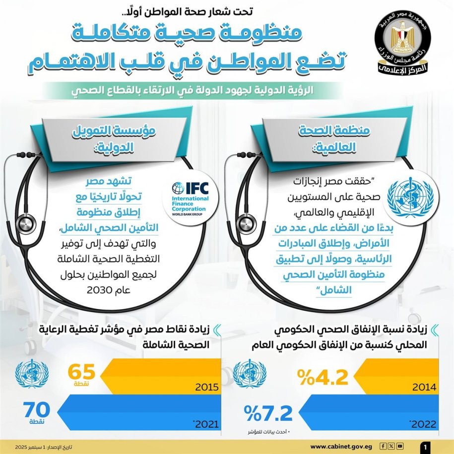 منظمة الصحة العالمية أشادت بالإنجازات التي حققتها مصر في القطاع الصحي، خاصة فيما يتعلق بالقضاء على بعض الأمراض المزمنة، وإطلاق المبادرات الرئاسية المهمة مثل مبادرة 100 مليون صحة، بالإضافة إلى تطبيق منظومة التأمين الصحي الشامل.
