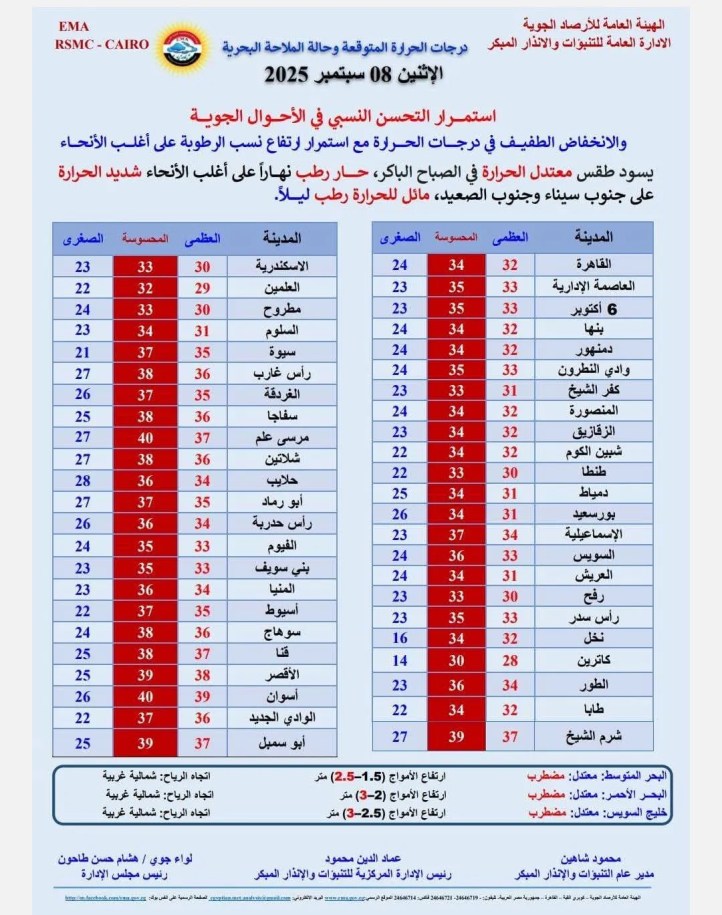 درجة الحرارة غدا في رأس سدر: العظمى 35 والصغري 25