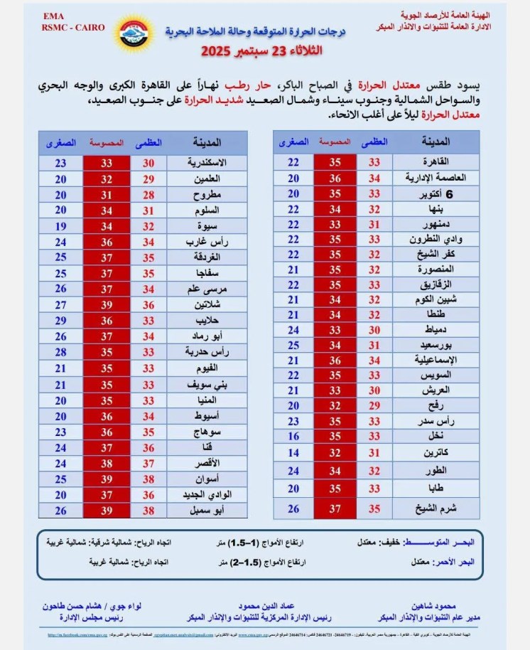 حول حالة الطقس غدًا الثلاثاء.. توقعت الهيئة العامة للأرصاد الجوية الإدارة العامة للتنبؤات والإنذار المبكر يسود طقس معتدل الحرارة في الصباح الباكر، حار رطب نهارا على القاهرة الكبري والوجة البحري والسواحل الشمالية وجنوب سيناء وشمال الصعيد، شديد الحرارة على جنوب الصعيد، معتدل الحرارة ليلا على أغلب الأنحاء.