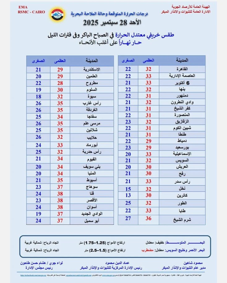 درجة الحرارة غدا في رأس سدر: العظمى 31 والصغري 22