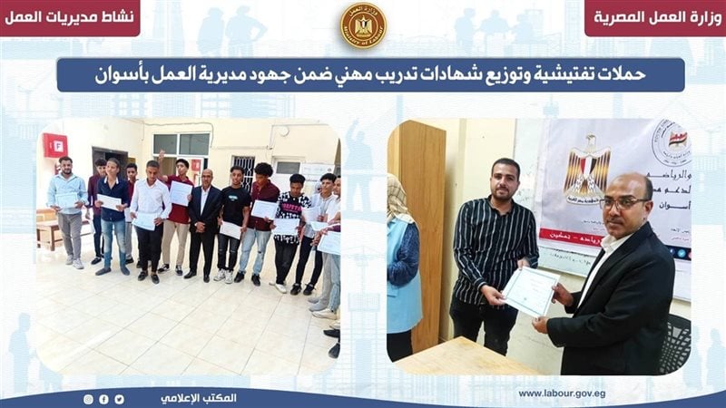 وقال محمود أحمد عيسى، مدير مديرية العمل بأسوان، إن تلك الجهود تأتي تنفيذًا لتوجيهات الوزير محمد جبران، وزير العمل، الذي يولي اهتمامًا خاصًا بإحكام الرقابة على سوق العمل من جهة، ودعم برامج التدريب المهني من جهة أخرى.
