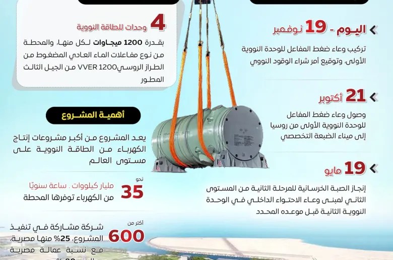 وتناول الإنفوجراف عددًا من الإنجازات البارزة خلال عام 2025، حيث شهد اليوم، الموافق 19 نوفمبر 2025، تركيب وعاء ضغط المفاعل للوحدة النووية الأولى، إلى جانب توقيع أمر شراء الوقود النووي، حيث وصل الوعاء من روسيا إلى ميناء الضبعة التخصصي يوم 21 أكتوبر.