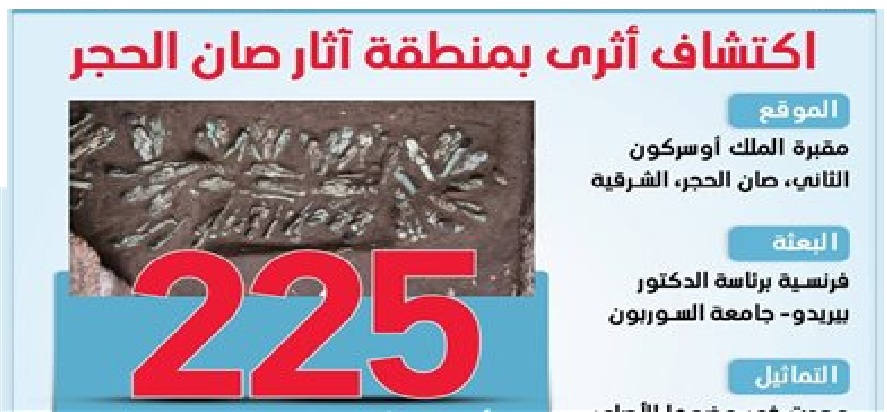 أعلن المجلس الأعلى للآثار عن توصل البعثة الأثرية الفرنسية العاملة بمنطقة آثار صان الحجر تانيس بمحافظة الشرقية، برئاسة الدكتور فريدريك بيريدو من جامعة السوربون، إلى اكتشاف أثري هام داخل إحدى المقابر الملكية الشهيرة بكنوزها، والتي تعود شهرتها إلى عام 1939