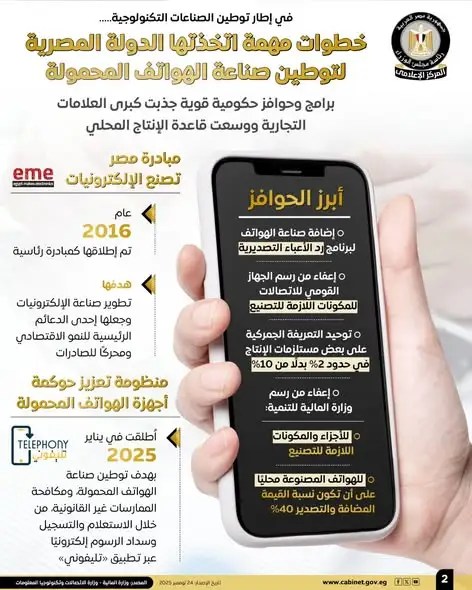 نشر المركز الإعلامي لمجلس الوزراء إنفوجرافات عبر منصاته على مواقع التواصل الاجتماعي، سلط من خلالها الضوء على الخطوات التي اتخذتها الدولة لتوطين صناعة الهواتف المحمولة، ضمن جهودها لتوطين الصناعات التكنولوجية.