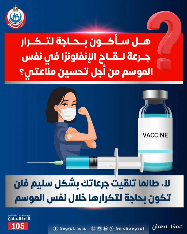 وأشار إلى أن تكرار الجرعة ليس له أي فائدة إضافية من الناحية الطبية، لذلك تؤكد وزارة الصحة أن الالتزام بجرعة واحدة سنويًا هو الإجراء الصحيح والمعتمد علميًا للحماية من الإنفلونزا الموسمية، خاصةً لدى الفئات الأكثر عرضة للمضاعفات مثل كبار السن، الحوامل، أصحاب الأمراض المزمنة، والعاملين بالقطاع الصحي.