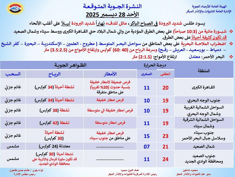 وفي بيانها عن حالة الطقس اليوم الأحد، أشارت هيئة الأرصاد إلى تكوّن الشبورة المائية منذ الساعات الأولى من الصباح وحتى فجر اليوم، على عدد من الطرق الزراعية والسريعة، خاصة في القاهرة الكبرى، شمال البلاد، وسط سيناء، وشمال الصعيد.