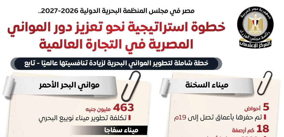 نشر المركز الإعلامي لمجلس الوزراء عددًا من الإنفوجرافات عبر منصاته على مواقع التواصل الاجتماعي، سلط من خلالها الضوء على فوز مصر بعضوية مجلس المنظمة البحرية الدولية 2026/2027، في خطوة استراتيجية نحو تعزيز دور المواني المصرية في التجارة العالمية.