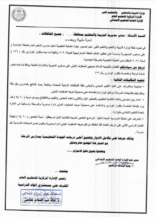 أصدرت وزارة التربية والتعليم والتعليم الفني تعليمات عاجلة لموجهي الصفوف الأولى على مستوى المديريات والإدارات التعليمية ، حيث تم تكليفهم بما يلي :