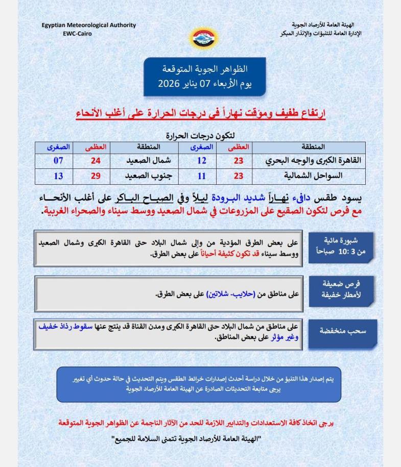أعلنت هيئة الأرصاد الجوية، أن الطقس غدا الأربعاء، على البلاد، يشهد ارتفاعًا طفيفًا ومؤقتًا في درجات الحرارة نهارًا على أغلب أنحاء الجمهورية، ليسود طقس دافئ خلال ساعات النهار، شديد البرودة ليلًا وفي الصباح الباكر.
