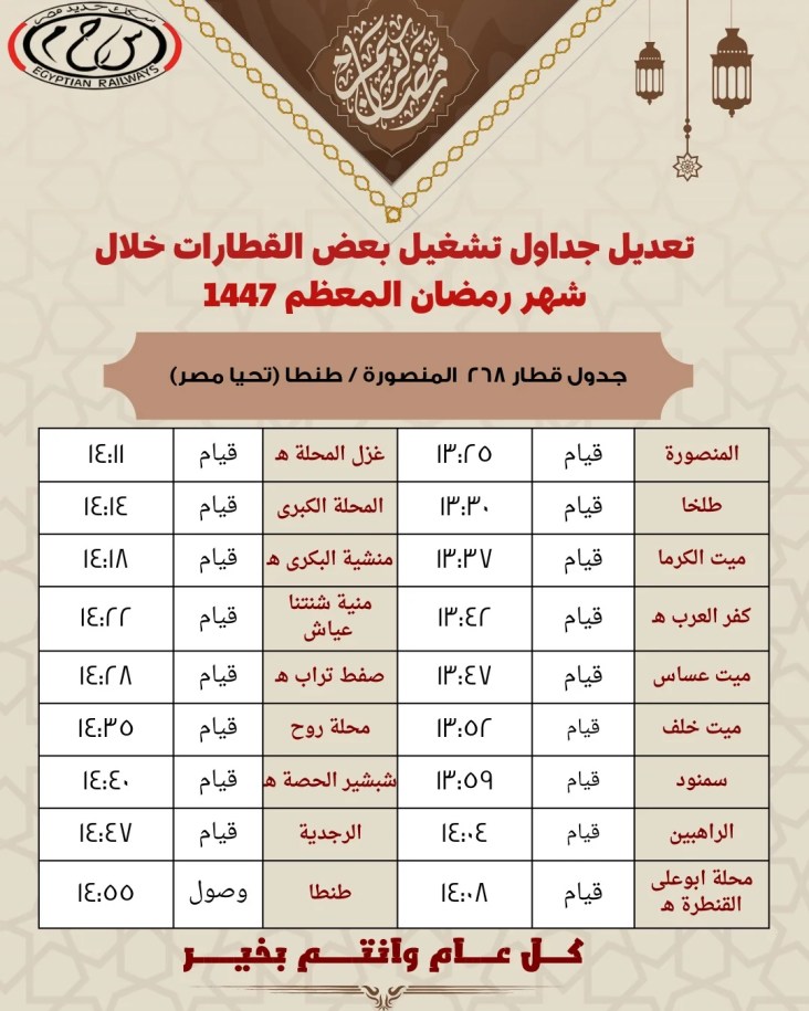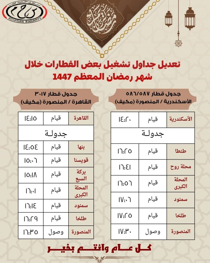 تعدل هيئة السكة الحديد مواعيد بعض القطارات على مختلف الخطوط، تيسيراً على جمهور الركاب وبما يتماشى مع مواعيد الإفطار وطبيعة الحركة في شهر رمضان المبارك. ويبدأ العمل بهذه المواعيد اعتباراً من يوم الأربعاء الموافق 18 فبراير 2026.