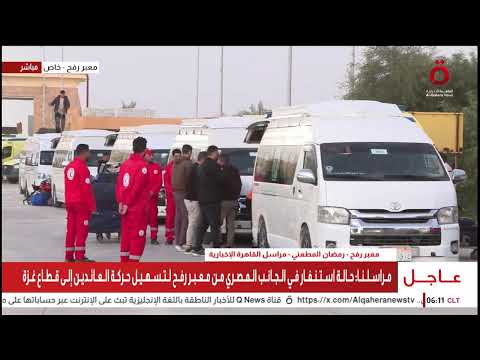 وقال مراسل قناة “القاهرة الإخبارية”، رمضان المطعني، من أمام معبر رفح، إن الفرق الميدانية في حالة استنفار في الجانب المصري من المعبر، حيث تتمركز فرق الهلال الأحمر المصري لدعم حركة العابرين وتقديم المساعدات اللازمة، بالتزامن مع الاستعداد لاستقبال دفعة جديدة من المصابين والمرضى الفلسطينيين لتلقي العلاج في المستشفيات المصرية.