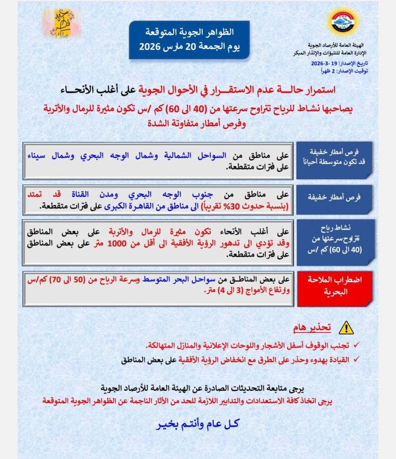 كشفت الهيئة العامة للأرصاد الجوية عن توقعات حالة الطقس غدا الجمعة الموافق 20 مارس 2026، أول أيام عيد الفطر المبارك، وسيشهد استمرار حالة عدم الاستقرار في الأحوال الجوية على أغلب الأنحاء، يصاحبها نشاط للرياح تتراوح سرعتها من (40 إلى 60) كم/س تكون مثيرة للرمال والأتربة، مع وجود فرص لسقوط أمطار متفاوتة الشدة.