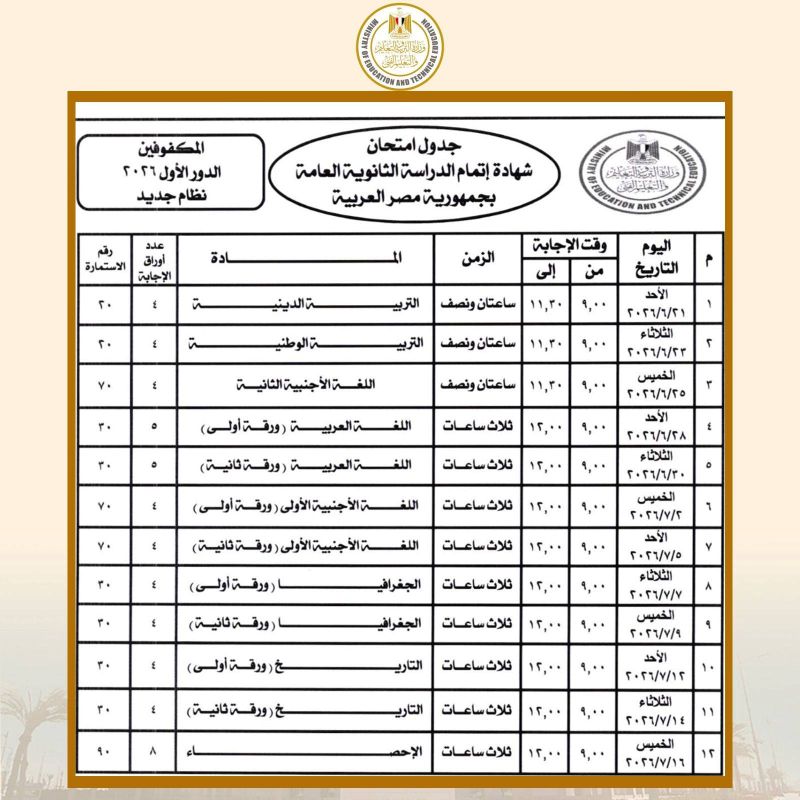 جدول امتحانات الثانوية العامة نظام جديد للعام الدراسي 2026