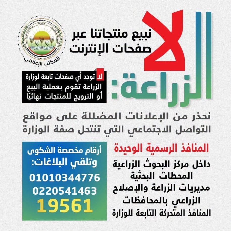 وتؤكد وزارة الزراعة بشكل قاطع أنه لا توجد أي صفحات رسمية تابعة لها أو لأي من قطاعاتها تقوم بعملية البيع أو الترويج للمنتجات نهائيًا عبر الإنترنت.
